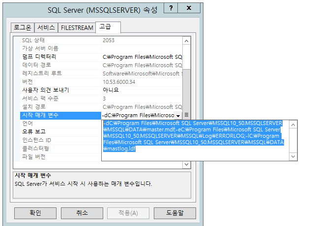 SQL Server Configuration Manager 에서 시작 매개변수의 경로 변경.