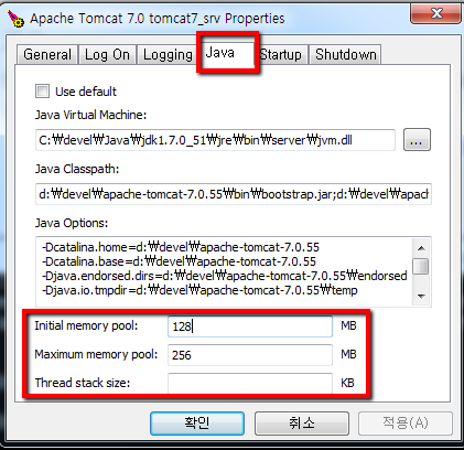 윈도 서비스로 구동할 경우 톰캣 구동 옵션은 catalina.bat 에 설정해도 적용이 되지 않으므로 파라미터를 이용하여 서비스 옵션에 직접 추가해야 한다.