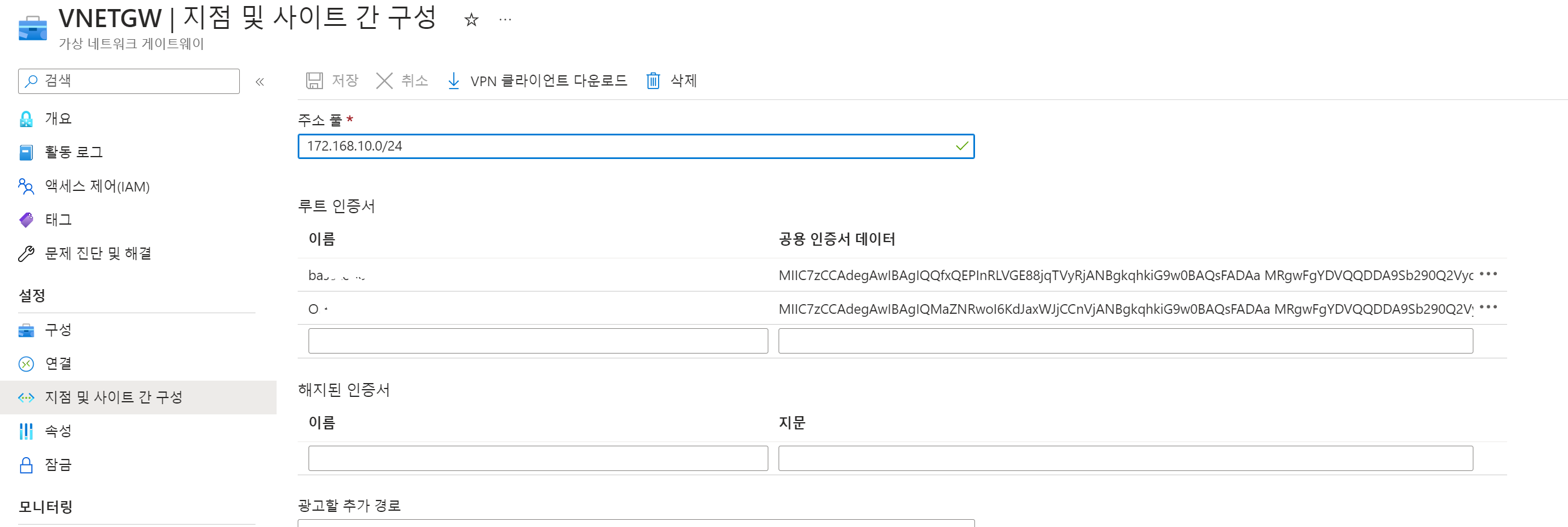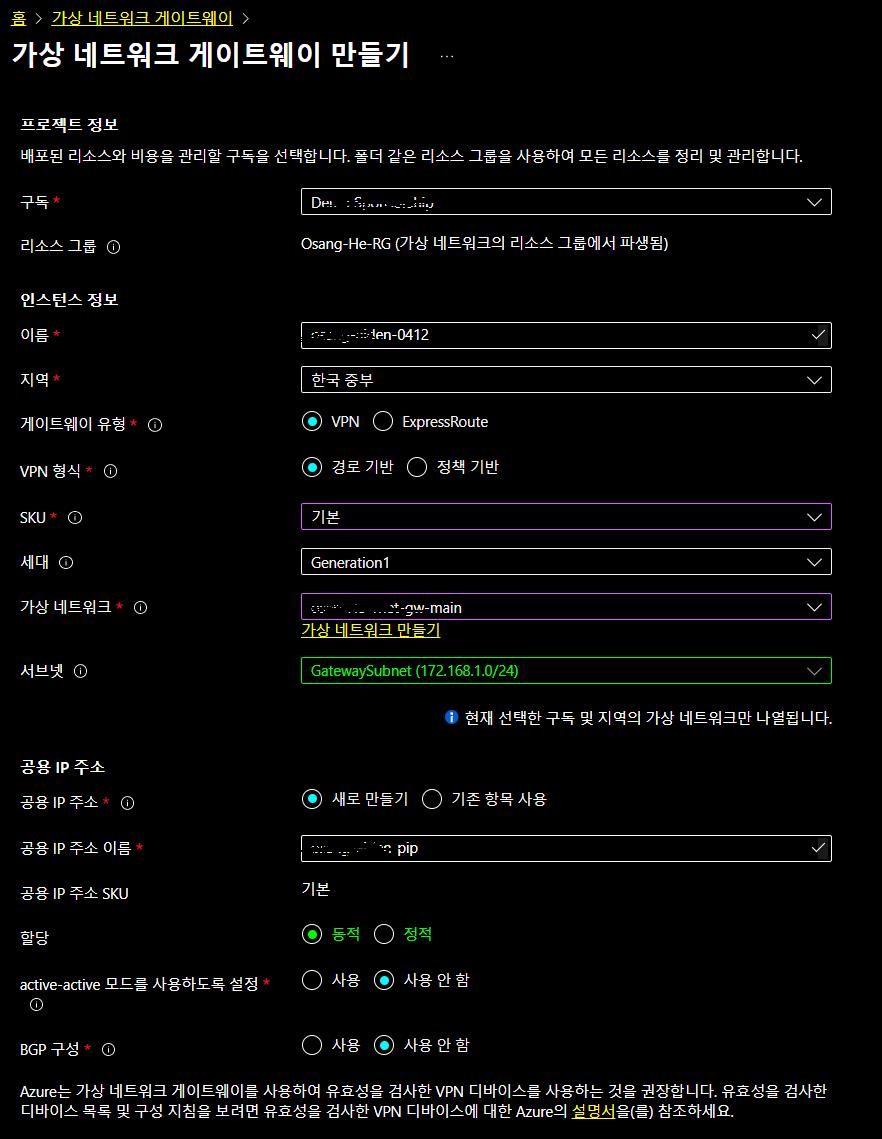 1. Azure VM 에 [가상 네트워크 게이트웨이] 설정.