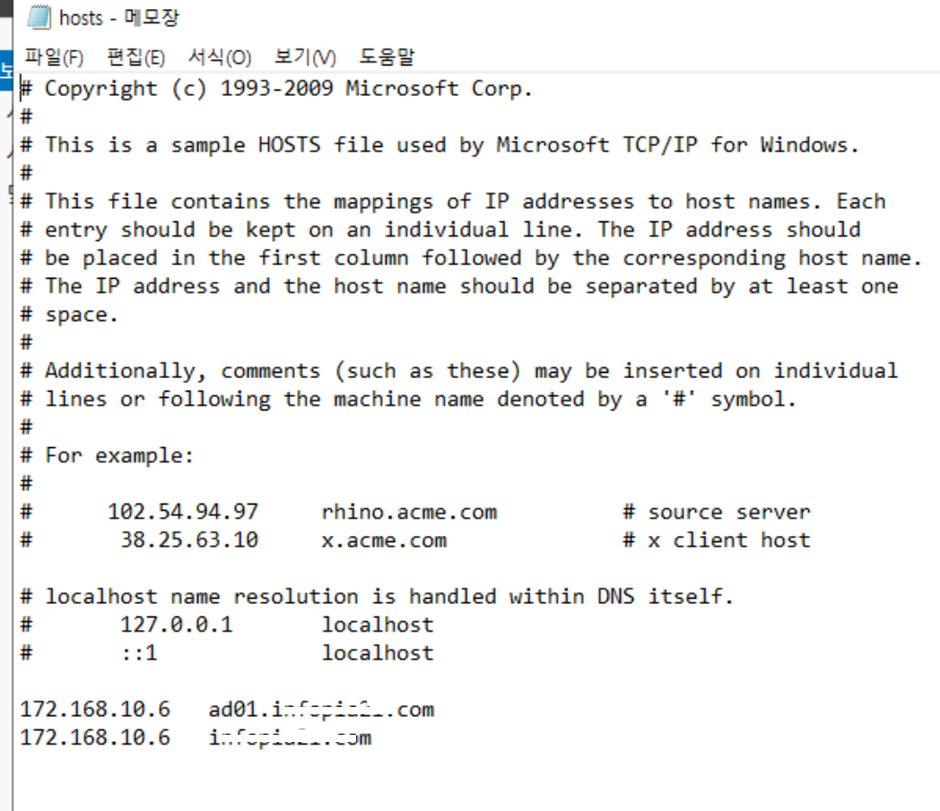 host 파일에 AD 의 라우팅 IP 를 추가해줬다.