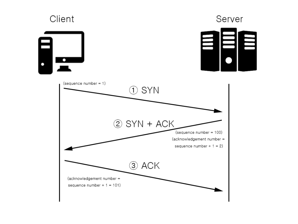 ③ 그리고 다시 Client는 방금 받은 SYN의 대답 격인 ACK 패킷(acknowledgement number 포함)을 Server에게 전달합니다. 일종의, "그럼 들어가겠습니다~" 라고 대답하는 과정이라고 보시면 됩니다. 여기서도 마찬가지로 acknowledgement number의 값은, 방금 받은 SYN 패킷의 sequence number 값에 일정 값을 증가시켜서 보냅니다.