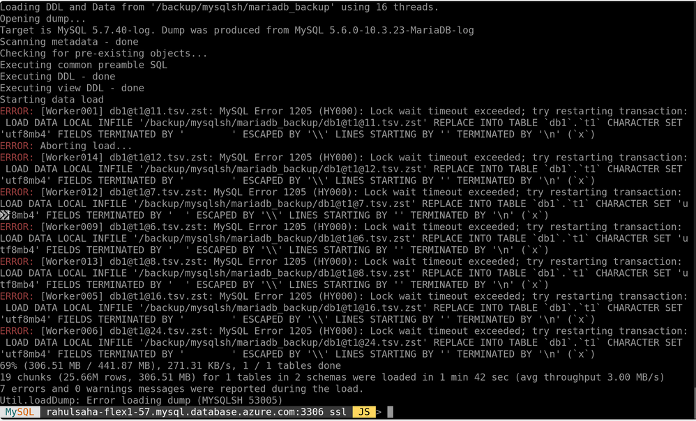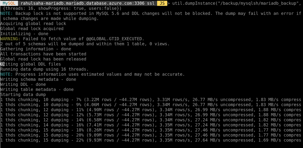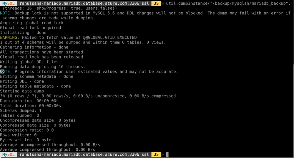 MySQL rahulsaha-mariadb.mariadb.database.azure.com:3306 ssl JS > util.dumpInstance("/backup/mysqlsh/mariadb_backup", {threads: 16, showProgress: true, users:false})