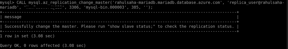 CALL mysql.az_replication_change_master('rahulsaha-mariadb.mariadb.database.azure.com', 'replica_user@rahulsaha-mariadb', 'StrongPass', 3306, 'mysql-bin.000003', 385, '');
