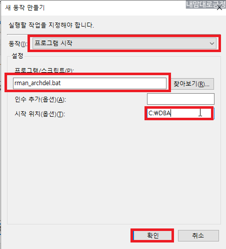 프로그램시작, 스크립트파일명, 시작위치에는 스크립트 파일이 있는 경로를 삽입