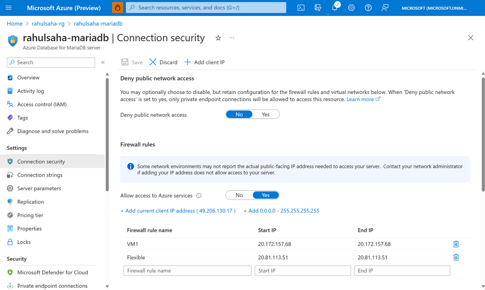 - To configure network settings on the source Azure Database for MariaDB server, ensure that the IP addresses of the VM used to perform the migration and the target Azure Database for MySQL server are whitelisted in the firewall on the source Azure Database for MariaDB server, as shown below.