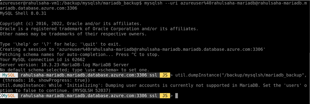 MySQL rahulsaha-mariadb.mariadb.database.azure.com:3306 ssl JS > util.dumpInstance("/backup/mysqlsh/mariadb_backup", {threads: 16, showProgress: true, users:false})