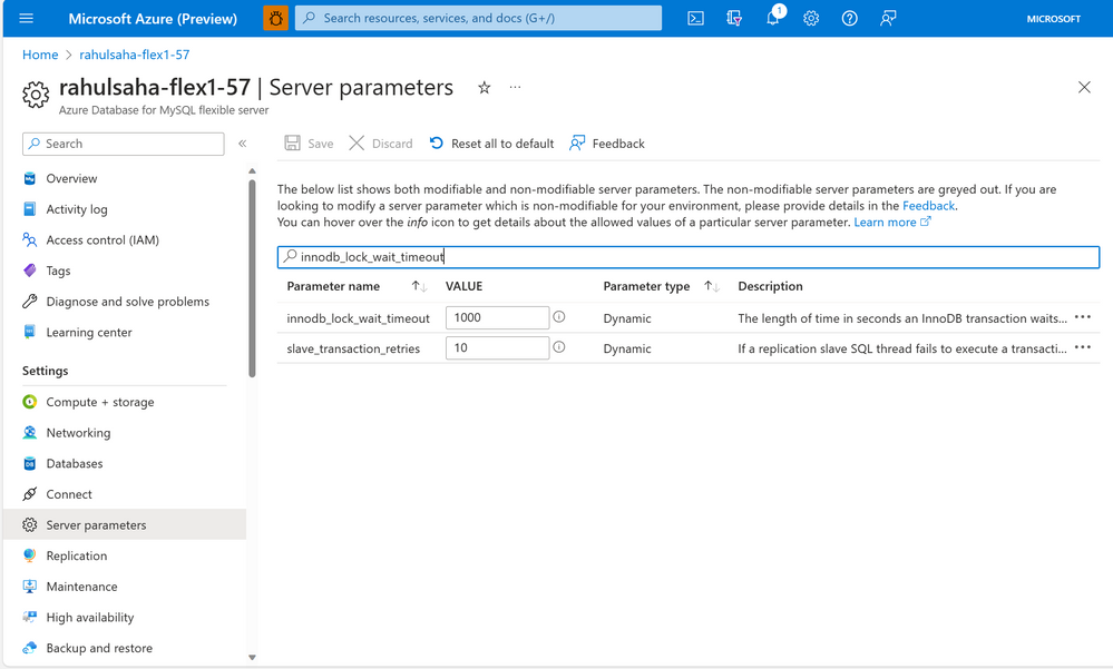 If you get this error, you can work around it by increasing the value of the “innodb_lock_wait_timeout” parameter in the Azure portal (as shown below), and then continuing the migration.
