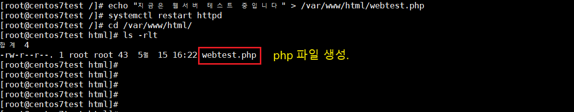 * echo "지금은 웹서버 테스트 중입니다" > /var/www/html/webtest.php