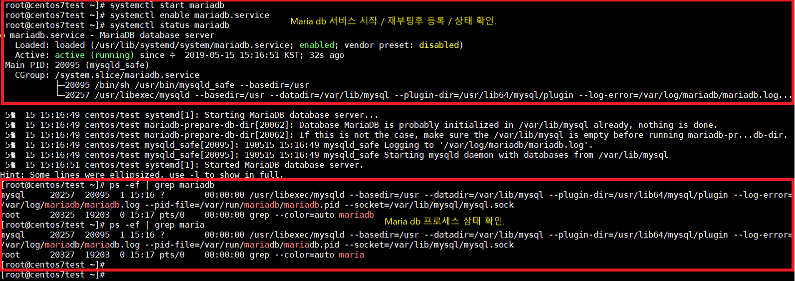 Maria db 서비스 시작 / 재부팅 후 등록 / 서비스 상태 확인 / 프로세스 상태 확인