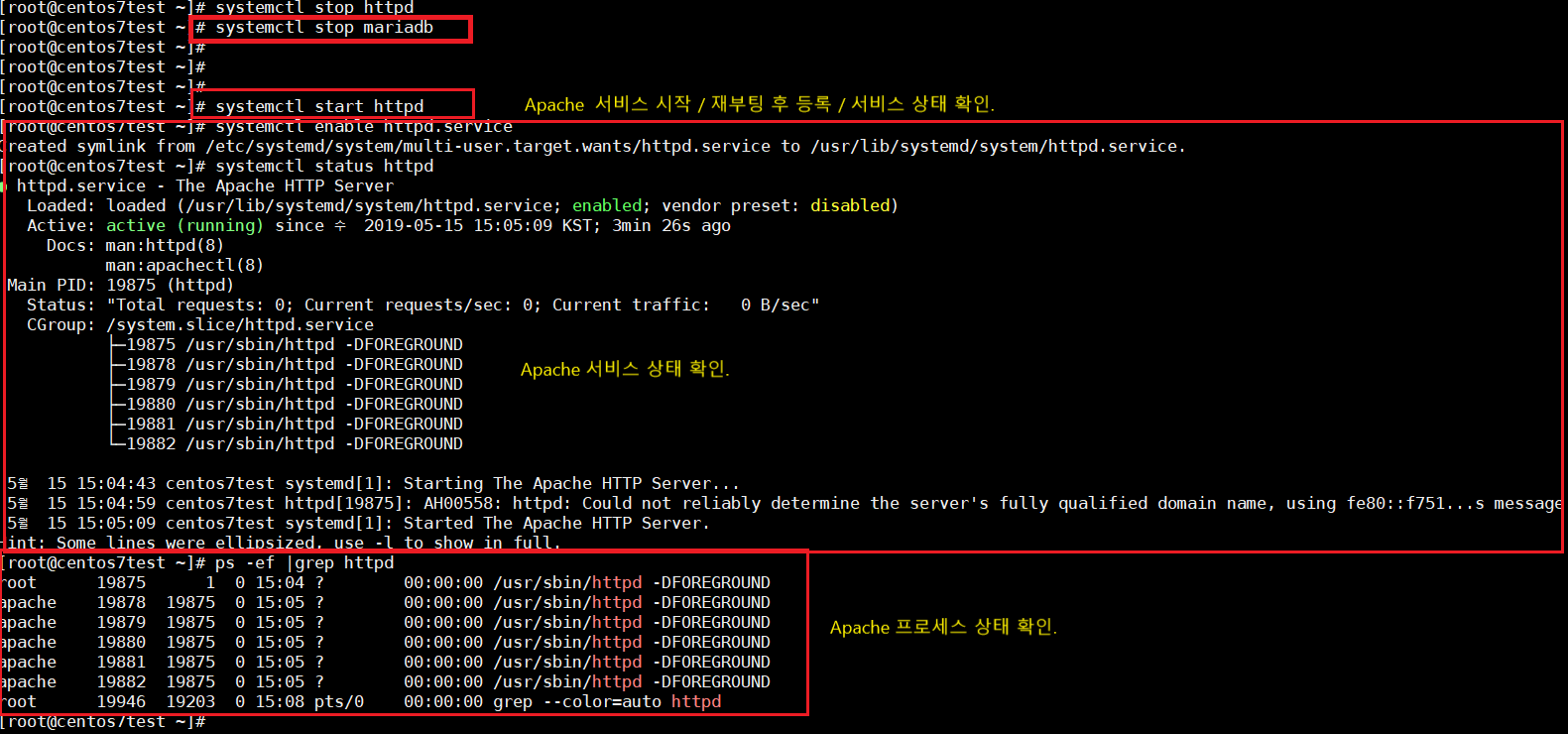 Apache 서비스 시작 / 재부팅 후 등록 / 서비스 상태 확인 / 프로세스 상태 확인