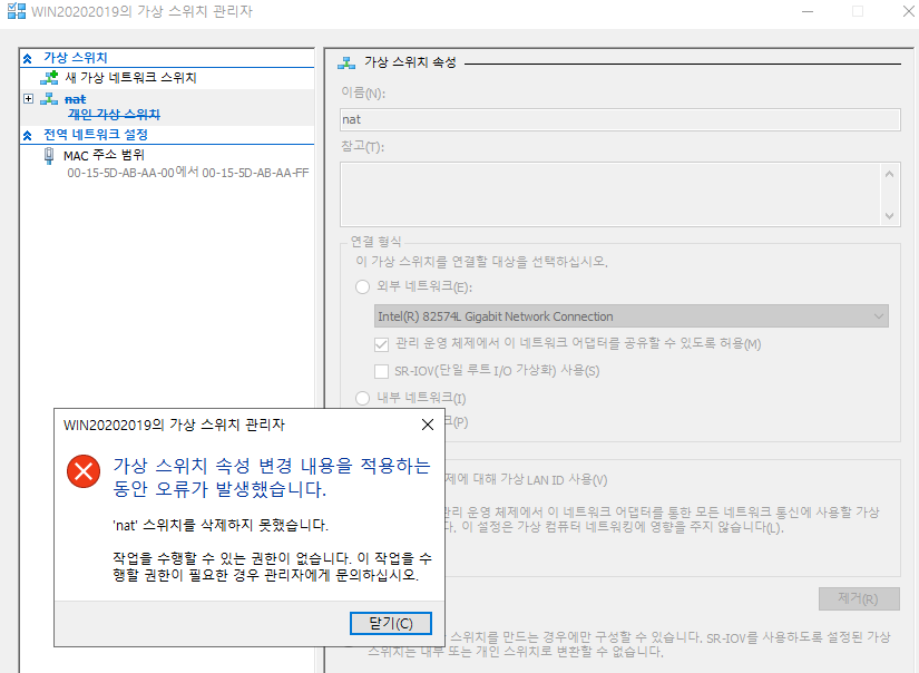 위와 캡쳐와 같이 가상 스위치 삭제가 안된다.
