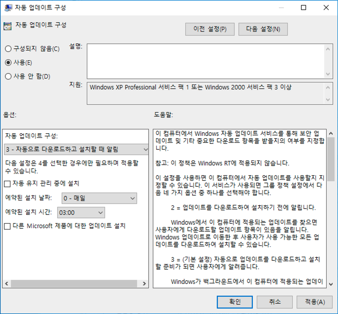 이 외에 자동 업데이트에 대한 구성 설정도 변경 해 봅시다.