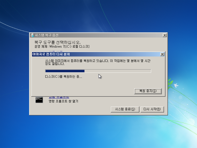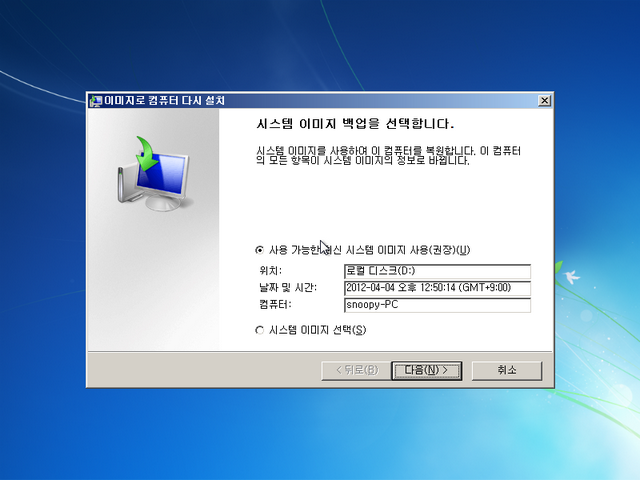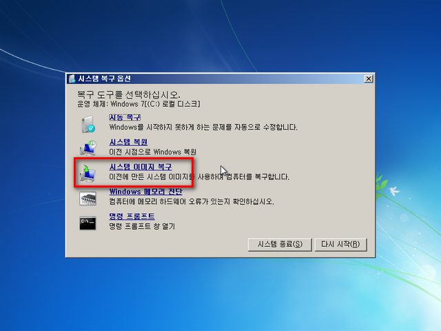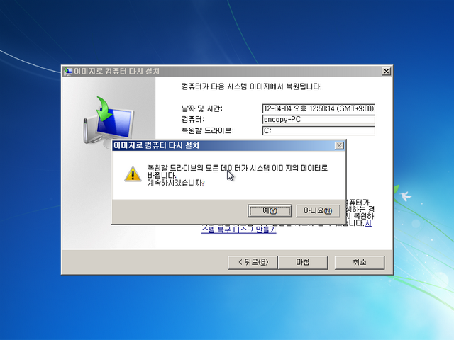 제가 이 글을 작성하면서 진행했던 백업 이미지로 복구를 시도했는데, 아무런 문제 없이 잘 복구되었습니다. 그동안 고스트나 트루이미지를 사용해 오셨다면, 윈도우 7 자체 백업 기능을 한번 사용해보세요. 저는 매우 만족스럽습니다. (사실 VHD 부팅 때문에 이 백업 기능을 사용하지는 않지만)