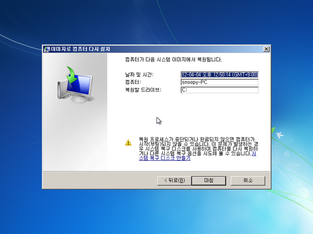 제가 이 글을 작성하면서 진행했던 백업 이미지로 복구를 시도했는데, 아무런 문제 없이 잘 복구되었습니다. 그동안 고스트나 트루이미지를 사용해 오셨다면, 윈도우 7 자체 백업 기능을 한번 사용해보세요. 저는 매우 만족스럽습니다. (사실 VHD 부팅 때문에 이 백업 기능을 사용하지는 않지만)
