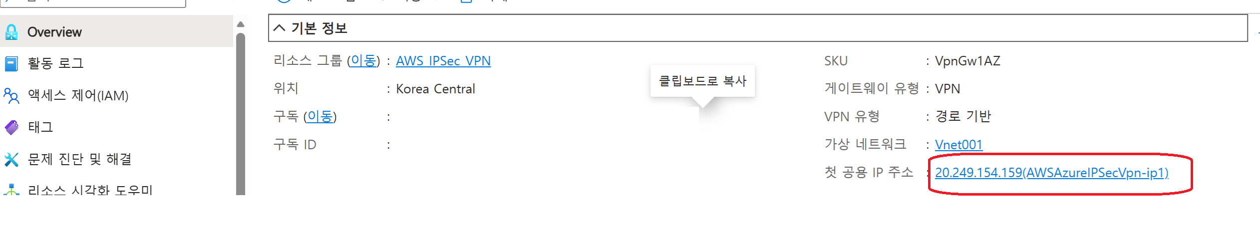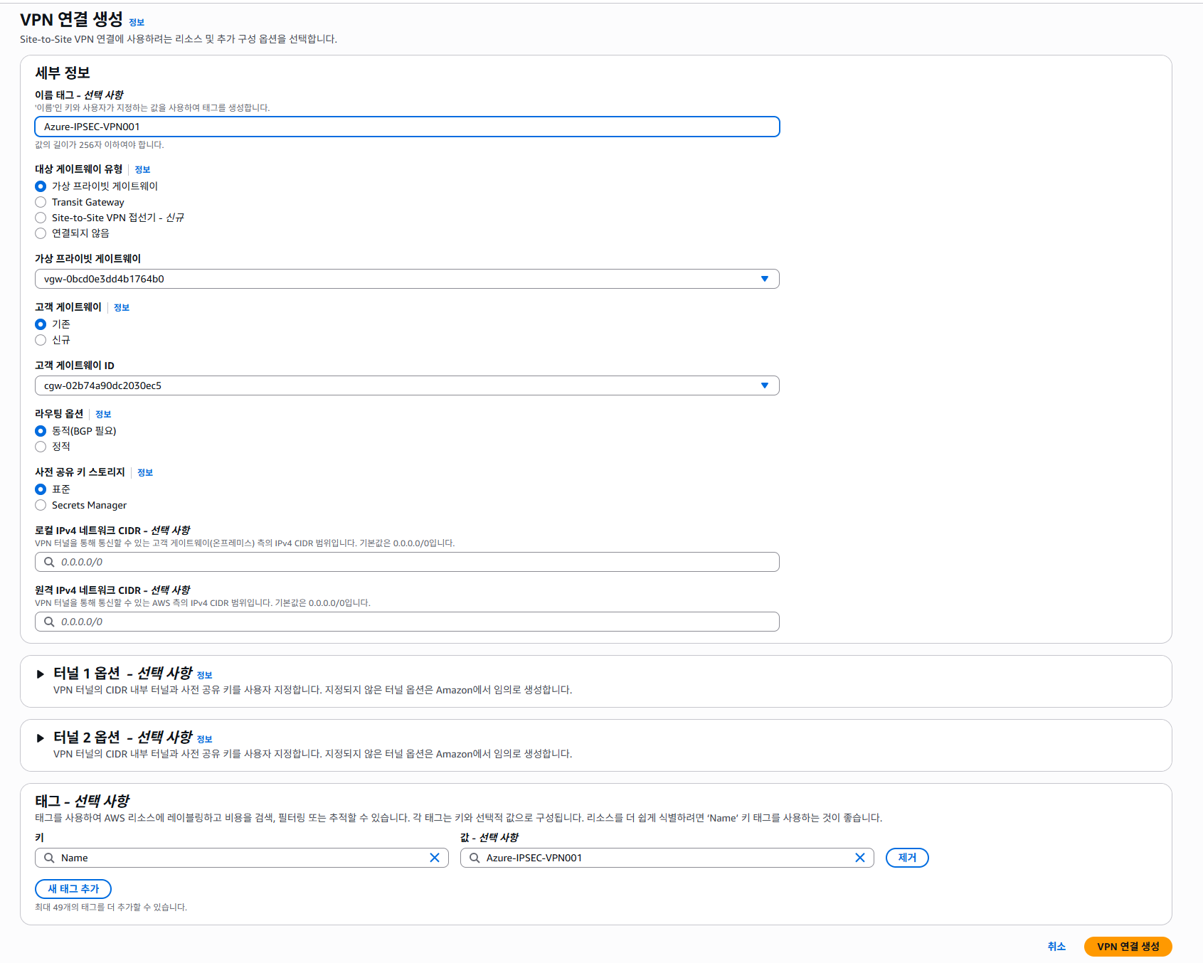 # 터널 1번. 내부 IPV4 CIDR 값 변경과, 사전 공유키 값을 인지하고 있기 바랍니다.