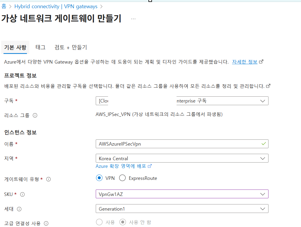 # Vnet 생성할때 Subnet 의 Gateway Subnet 을 생성해줘야 합니다.