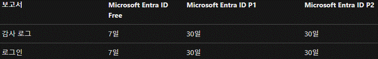 무료 버전의 경우 7일, Microsoft Entra ID P1 및 P2 라이선스를 사용하는 경우에는 30일 동안 보존됩니다. 또한, 프리미엄 라이선스를 구매하더라도 과거(지난달)의 데이터를 확인할 수는 없습니다.