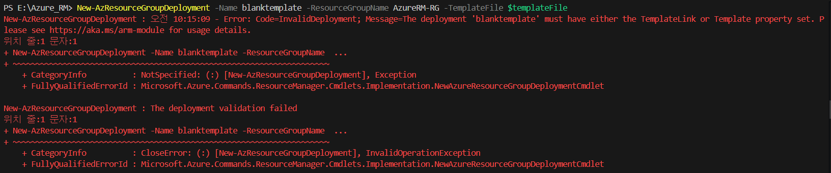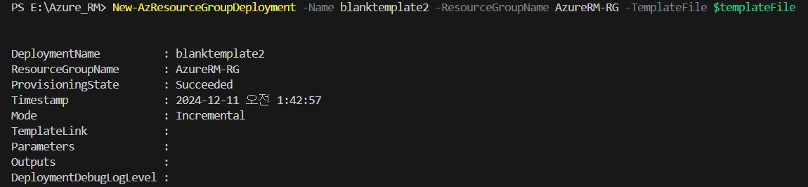 New-AzResourceGroupDeployment -Name blanktemplate -ResourceGroupName AzureRM-RG -TemplateFile $templateFile