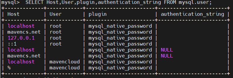 SELECT Host,User,plugin,authentication_string FROM mysql.user;