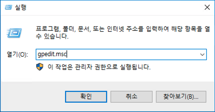 먼저 실행창에서 gpedit.msc 입력해 로컬 그룹 정책 편집기를 실행합니다.