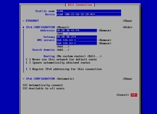 [root@localhost ~]# nmcli c m eth0 ipv4.method manual connection.autoconnect yes ipv4.addresses 10.20.30.41/24 ipv4.gateway 10.20.30.254 ipv4.dns "168.126.63.1 168.126.63.2"