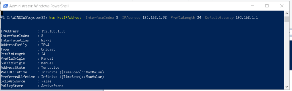 New-NetIPAddress -InterfaceIndex “IndexNo” -IPAddress xxx.xxx.xxx.xxx -PrefixLength 24 -DefaultGateway xxx.xxx.xxx.xxx