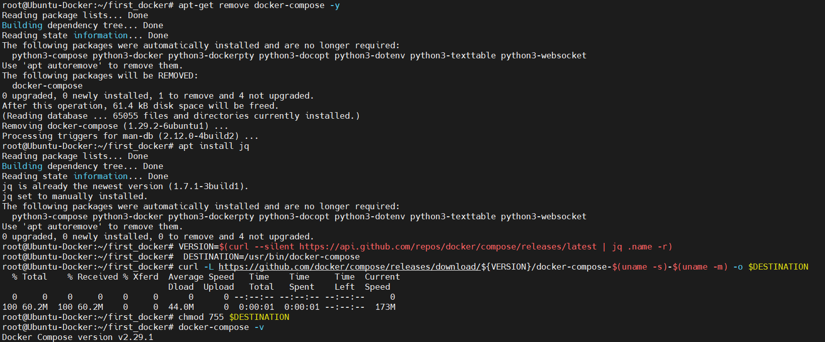 $ sudo apt-get remove docker-compose -y